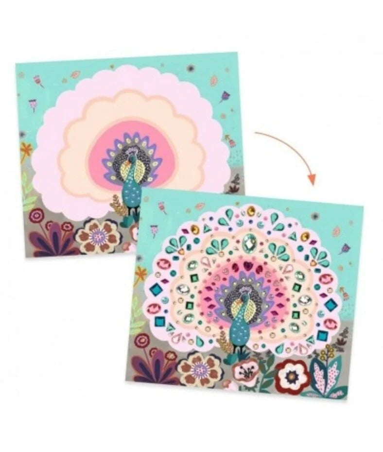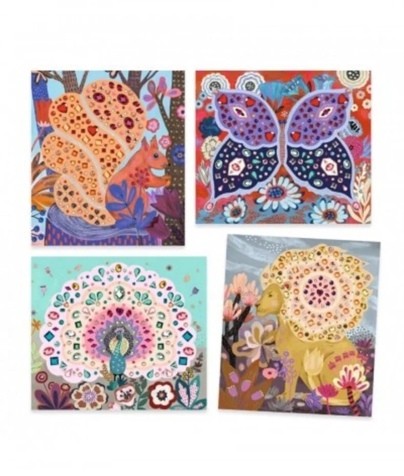 Met deze kit kunnen 4 geïllustreerde kaarten afgemaakt en versierd worden met tal van verschillende mini-diamantjes met uiteenlopende kleuren en vormen. Elk vel met strass hoort bij een specifiek schilderijtje om te versieren. Door de stap-voor-stap uitleg te volgen brengt het kind reliëf en glans aan op de schilderijtjes waardoor de illustraties nog mooier worden.