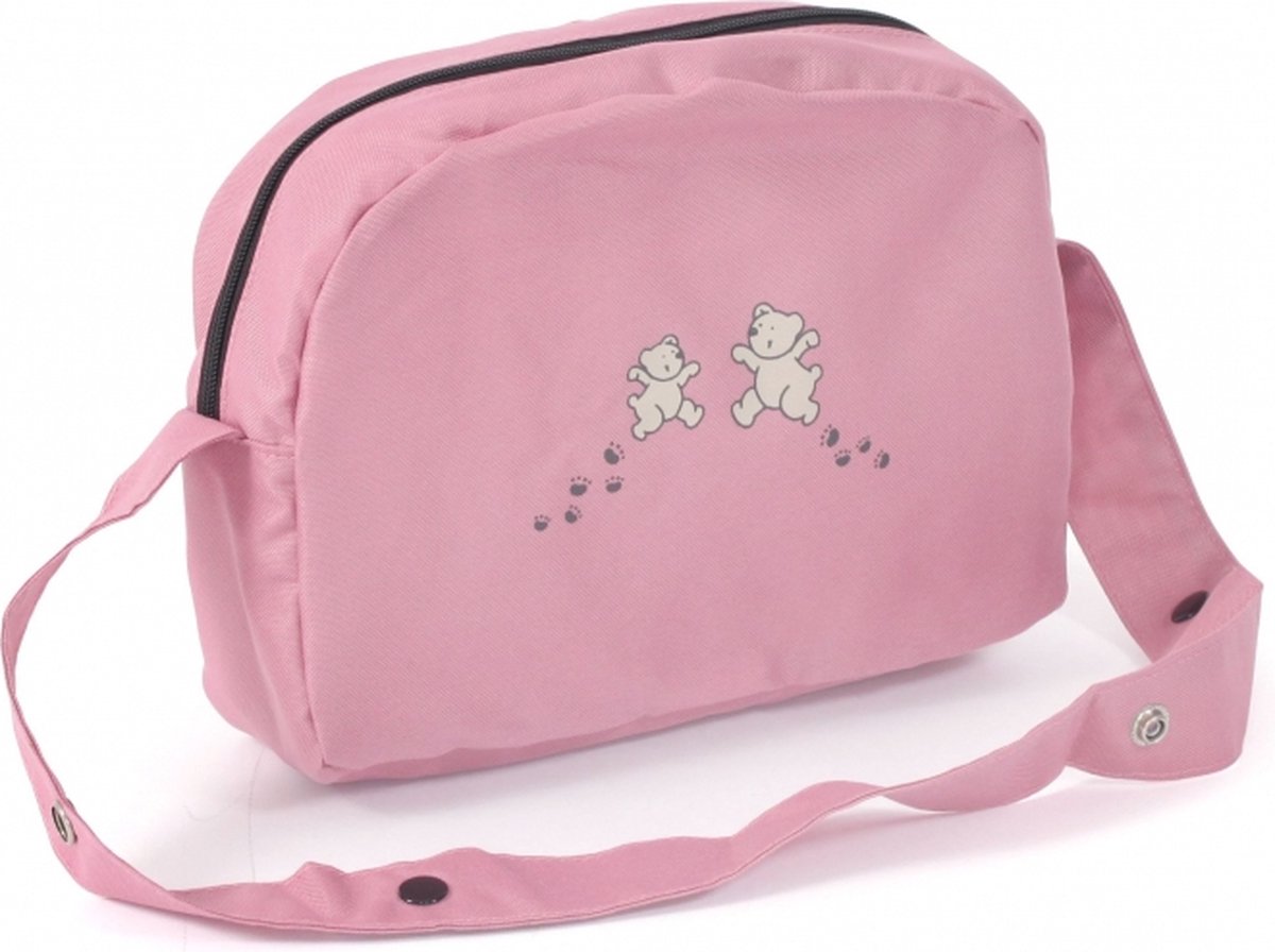 Deze schattige poppenluiertas is perfect voor kleine verzorgers! De tas is gemaakt van stevig stof (ongevoerd) en heeft een lief roze design met beertjes.