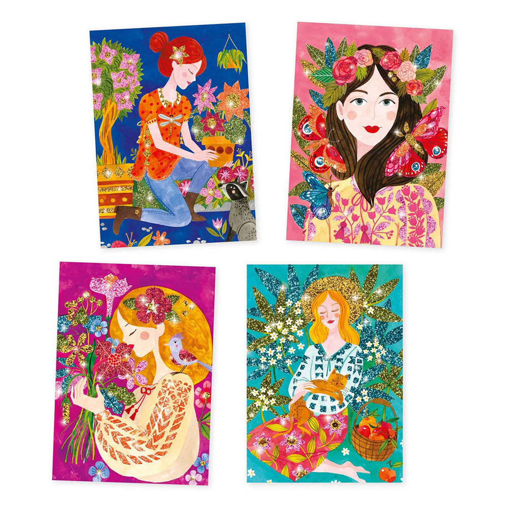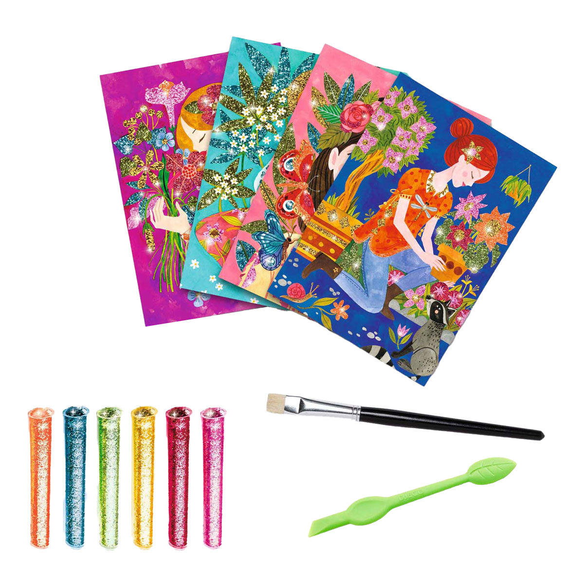 4 kleurplaten met charmante bloemenmeisjes die verlicht worden met kleurrijke glitter. De kinderen leggen hun tekening in de doos, maken de voorgelijmde vlakken open met het meegeleverde gereedschap en bestrooien ze vervolgens met glitterpoeder volgens de kleurcode in het boekje. Aan het einde van de activiteit glinstert het vredige landschap, tot groot vermaak van de kinderen!